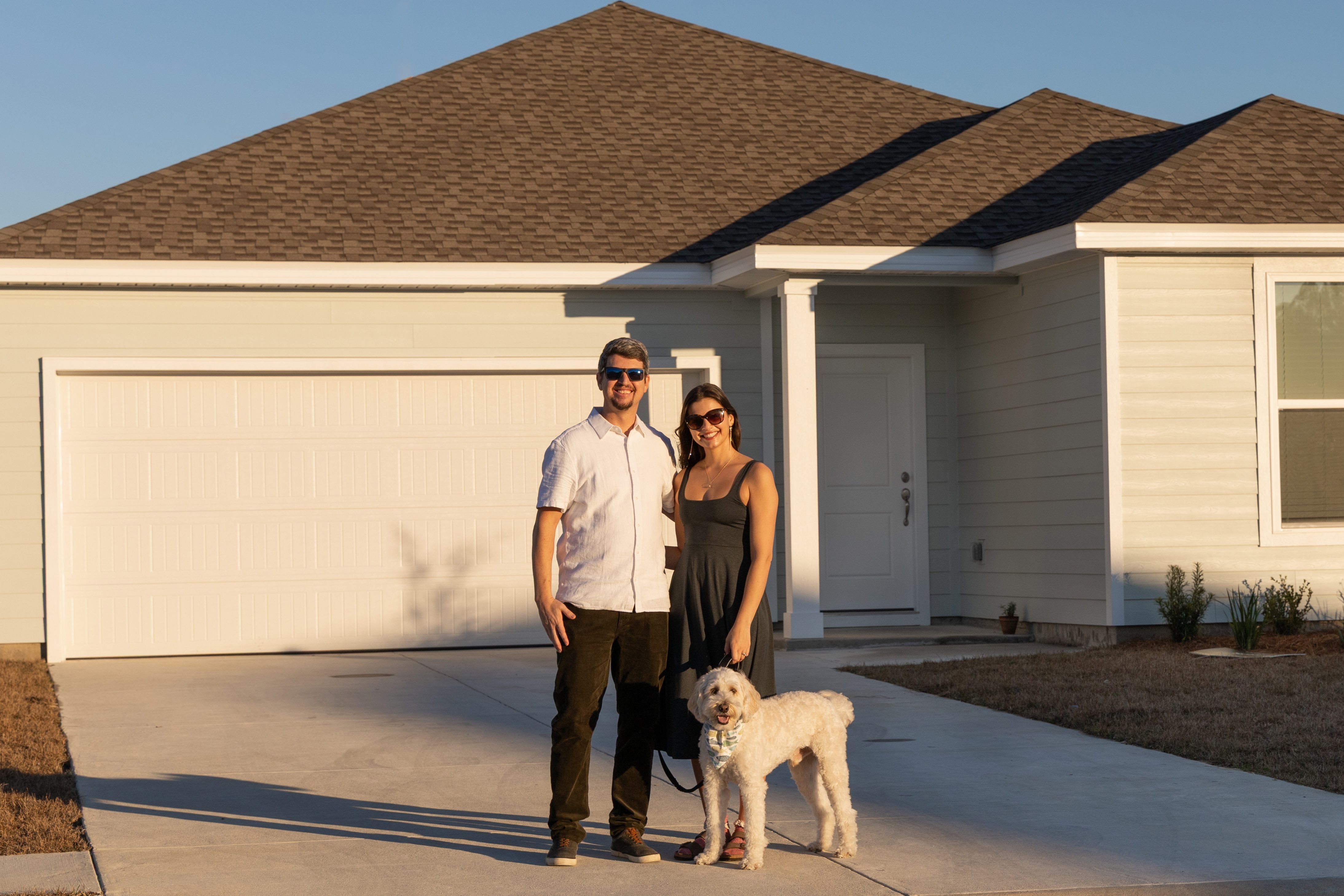 Kira, Jake, and their pup Gilly at their home in Northwest Florida.